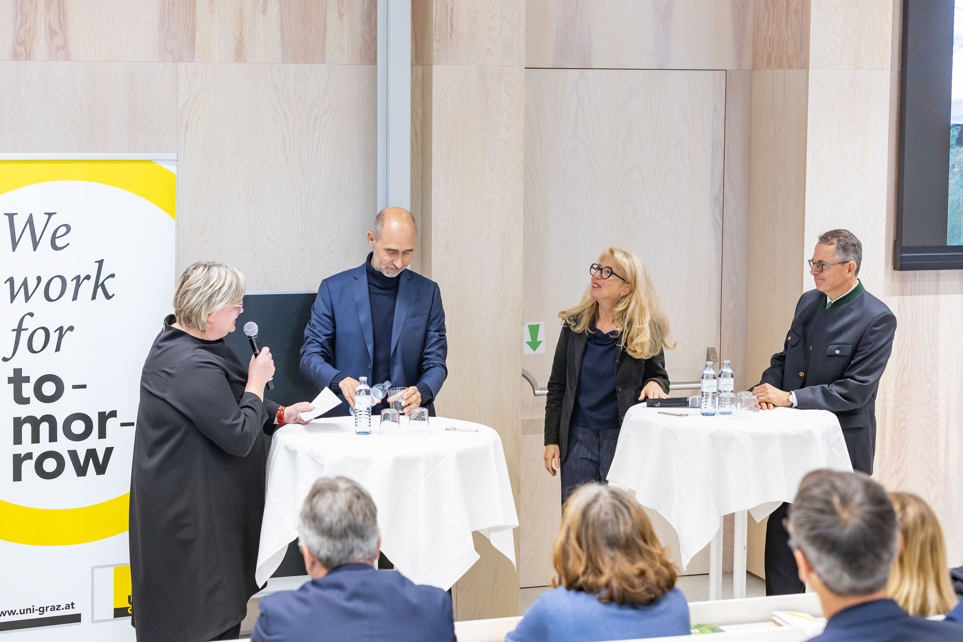 „Dass es gelungen ist, das Jesuitenrefektorium unter Erhaltung der denkmalgeschützten Mauern zu revitalisieren, ist allein schon eine großartige Leistung. Es ist mehr als erfreulich, dass das Gebäude von der Uni Graz genutzt wird. Dafür danke ich allen, die ihr Know-how und finanzielle Mittel eingebracht haben, um dem Gebäude neues Leben einzuhauchen“, führte Elke Kahr, Bürgermeisterin der Stadt Graz, aus.