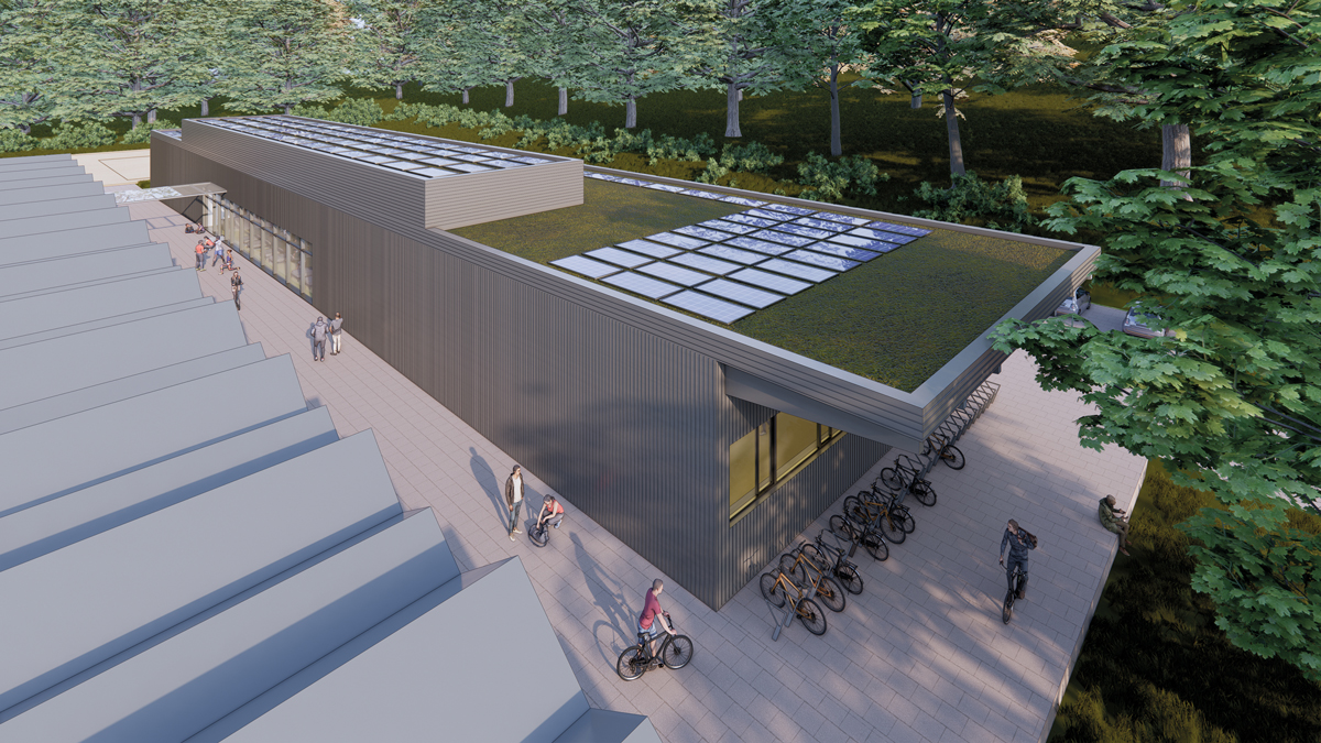 Der zweigeschossige, 1.300 m² große Neubau wird nach den besonders hohen Nachhaltigkeitsstandards der BIG realisiert. Das komplette Flachdach mit einer Fläche von 1.200 m² wird für Photovoltaik-Paneele und Dachbegrünung genutzt. Die Leistung der Anlage beträgt ca. 70 kwp, was dem ungefähren Stromverbrauch von 15 Vier-Personen-Haushalten entspricht. 30 überdachte Fahrradabstellplätze werden errichtet. In den 365 m³ Holz sind zwischen 350 und 400 t CO2 gebunden.