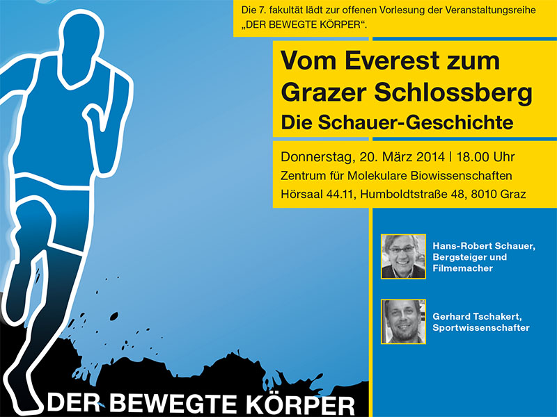 Er war der erste Österreicher auf dem Mount Everest und hat als Begründer des Berg- & Abenteuerfilmfestivals Graz „Gipfelsiege“ errungen. Hans-Robert Schauer ist einer der erfolgreichsten Österreichischen Bergsteiger und Filmemacher. In einer weiteren Ausgabe der Reihe „der bewegte Körper“ ist Schauer am 20. März 2014 an der Uni Graz zu Gast. Mit Sportwissenschafter Dr. Gerhard Tschakert wird er seine „Schauer-Geschichte“ zwischen Schloßberg und Mount Everest hautnah erzählen.