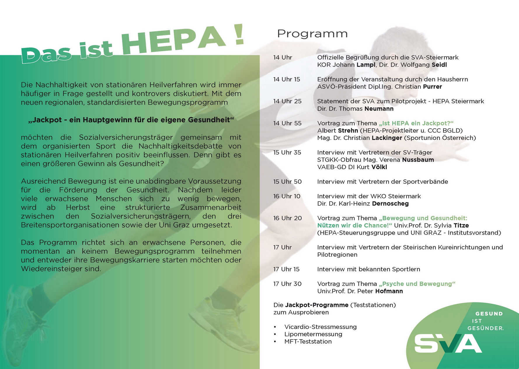 Im Rahmen dieses Projekts werden sogenannte JACKPOT-Programme, das sind standardisierte Bewegungsprogramme in Sportvereinen, angeboten. Das Ziel von HEPA-Steiermark ist es, den Kurteilnehmer/innen nach dem Kuraufenthalt in ihrer Wohnumgebung attraktive und gesundheitswirksame Bewegungsprogramme anzubieten.