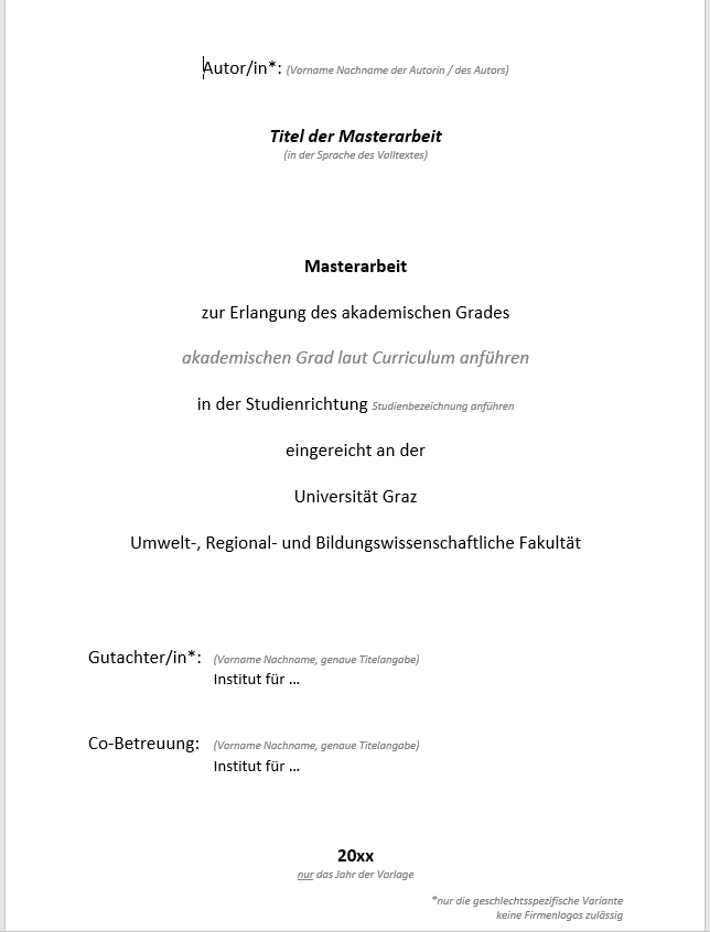 Bitte erkundigen Sie sich auf der Homepage vom URBI Dekanat bezüglich Prozess und Mustervorlage Studienabschluss - Umwelt-, Regional- und Bildungswissenschaften (uni-graz.at)
