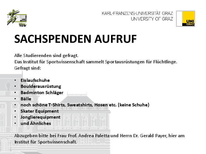 Das Institut für Sportwissenschaft sammelt Sportausrüstungen für Flüchtlinge. Gefragt sind: