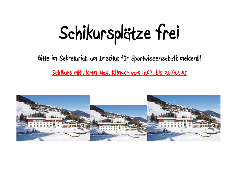 Für den Schikurs I vom 14.03. bis 21.03.2015, mit Herrn Mag. Klinger auf der Maria Alm, Hintermoos sind noch Plätze frei.